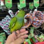 Hand fed Nanday Conure shy at first will need some work to get used to new owner.